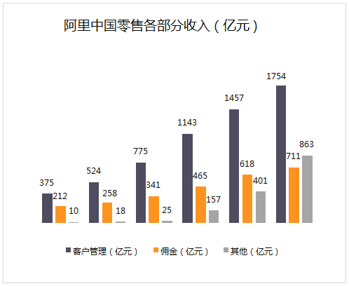 阿里国内零售业务的收入构成中,除了淘宝、天猫的客户管理和佣金收入,还有来自同城零售的收入,被归入“其他”收入。这部分由天猫超市、淘鲜达、盒马鲜生和天猫国际等部门带来的直营业务收入,在迅猛增长。