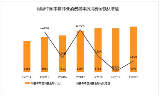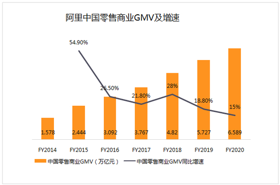 截至2020年3月底的2020财年,阿里中国零售商业GMV(一定时间内的成交总额)达到6589万亿元(人民币,以下同),比上一财年增加15%。
