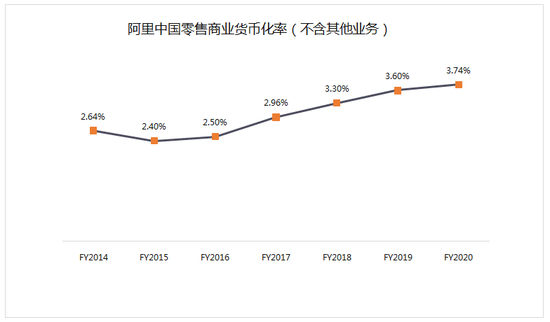 如果剔除“其他”部分对收入和GMV的影响,阿里国内零售GMV的货币化率如下图: