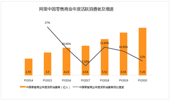 GMV是由网购人数以及每人消费的金额决定的。2020财年,淘宝、天猫的年度活跃买家已经达到7.26亿。Quest Mobile发布的最新数据显示,截止2020年Q1,中国移动互联网用户突破11.56亿。