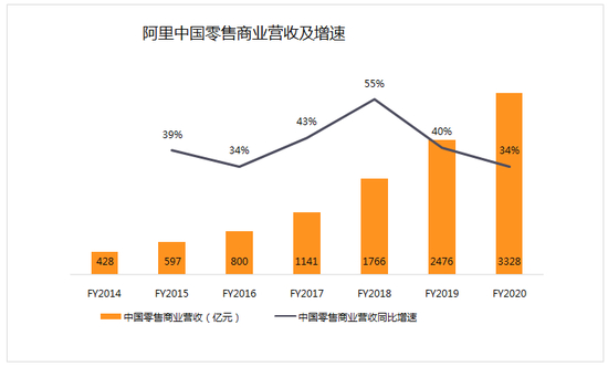 阿里国内零售业务GMV增速降低的同时,营收增速明显高于前者。2020财年GMV增速只有15%,但营收达到3328亿元,同比增速为34%。