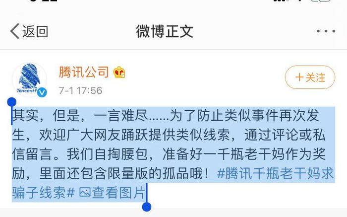 今日晚间腾讯公司在官方微博回应“被骗”一事,称一言难尽,并为了防止类似事件再次发生,以1000瓶老干妈为礼品征求类似线索。