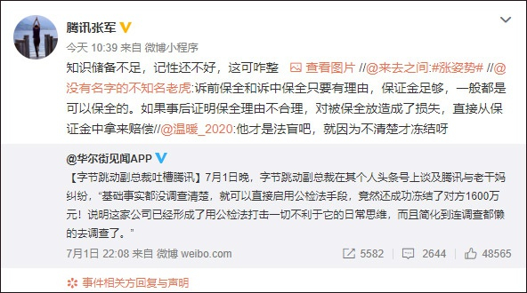 (文/观察者网 一鸣)针对字节跳动副总裁吐槽腾讯“基础事实都没调查清楚就启用公检法机关”一事,7月2日上午,腾讯公司公关总监张军发微博回应,称前者“知识储备不足,记性还不好,这可咋整”。