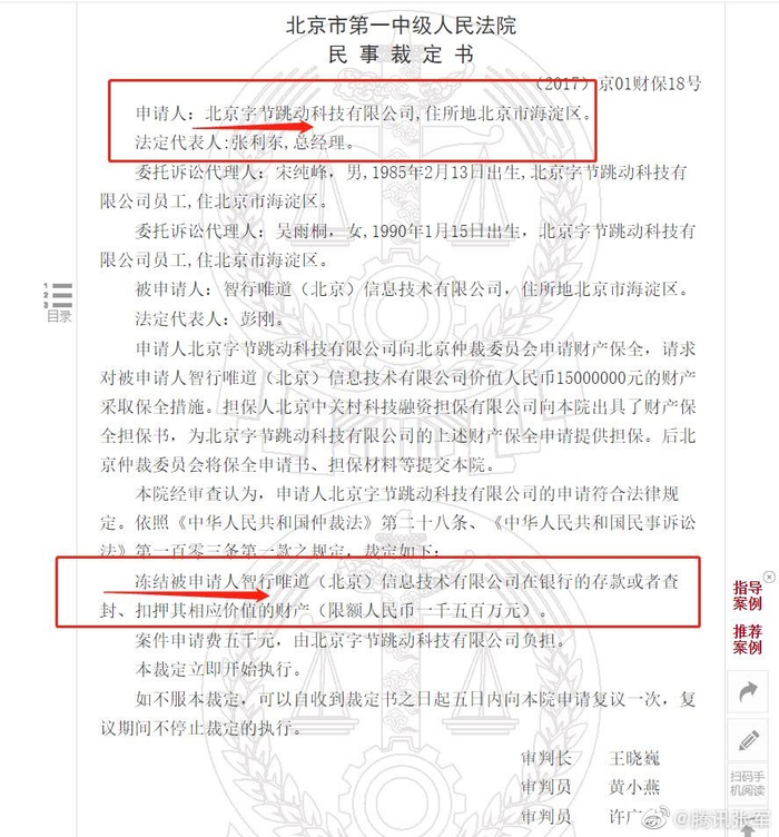 同时,张军还晒出了此前字节跳动申请冻结另一家公司财产的裁定书。