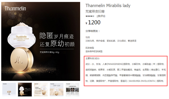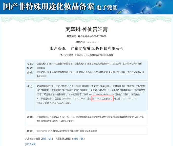 此外,梵蜜琳官方网站对于“梵蜜琳贵妇膏”的主要成分仅披露了部分内容,该产品实际在国产非特殊用途化妆品备案中还有“DMDM 乙内酰脲”,“丙二醇”,“CI 77491”,“CI 77492”,“玫瑰(ROSA RUGOSA)花油等成分。
