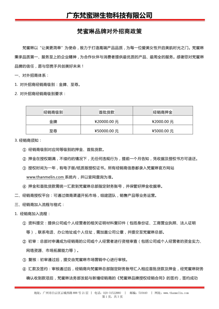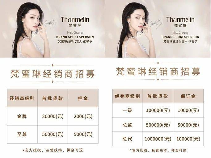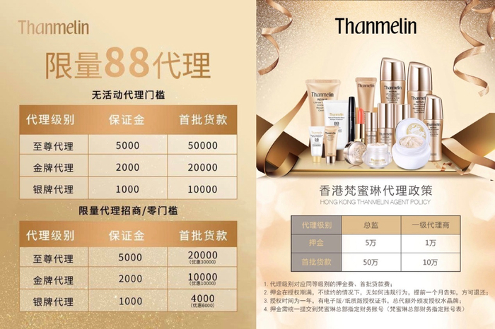 目前,梵蜜琳官方网站对外公开的招商体系有两级:金牌、至尊。其中,金牌代理首批货款为2万元,经销商押金为2千元;至尊代理首批货款为5万元,经销商押金为5千元。