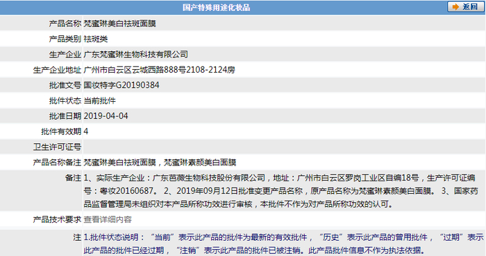 通过国家药品监督管理局查询可知,该产品为“国产非特殊用途化妆品备案信息”,而美白、淡斑均为特殊用途化妆品所具有的功效。而具有“国产特殊用途化妆品”备案的7款产品中“梵蜜琳神仙贵妇膏”并不在列,同时,国家药品监督管理局未对这7款产品所称功效进行审核,因此,批件不作为对产品所称功效的认可。