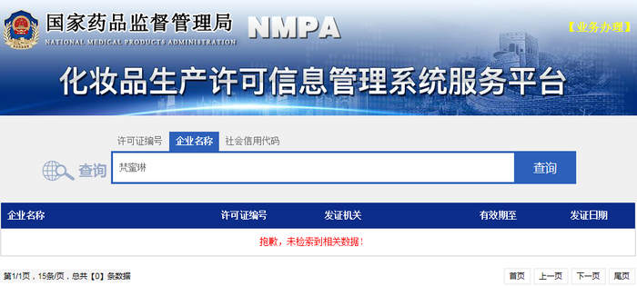 中国网财经记者在国家药品监督管理局化妆品生产许可信息管理系统服务平台搜索企业“广东梵蜜琳生物科技有限公司”,结果显示未检索到相关数据。