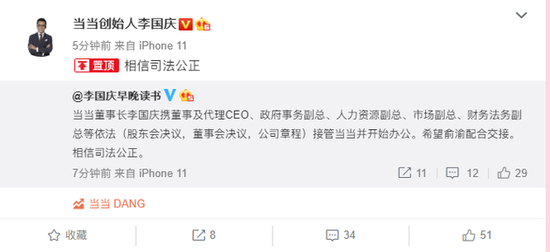 随后,李国庆在微博称,当当董事长李国庆携董事及代理CEO、政府事务副总、人力资源副总、市场副总、财务法务副总等依法(股东会决议,董事会决议,公司章程)接管当当并开始办公。希望俞渝配合交接。相信司法公正。