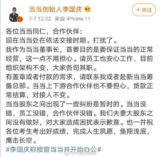 最新消息,7月7日午间,李国庆再度发布微博称,“我作为当当董事长,首要目的是要保证当当的正常经营,这一点不用担心。请员工也安心工作,目前组织架构不变,大家各司其职。”