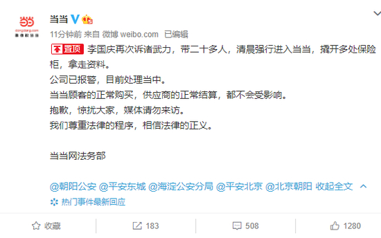 7月7日上午,当当官方微博发文称,李国庆再次诉诸武力,带二十多人,清晨强行进入当当,撬开多处保险柜,拿走资料。公司已报警,目前处理当中。