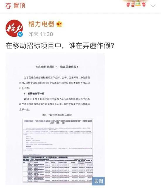 格力称,重庆美的通用制冷设备有限公司(简称“重庆美的”)在中国移动招标项目中存在发票信息不一致和技术参数不符合招标标准两大问题。同时,从“弄虚作假、暗箱操作“等说辞也不难看出,格力还在字里行间暗暗对中国移动发难。