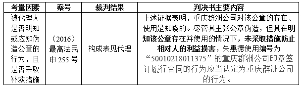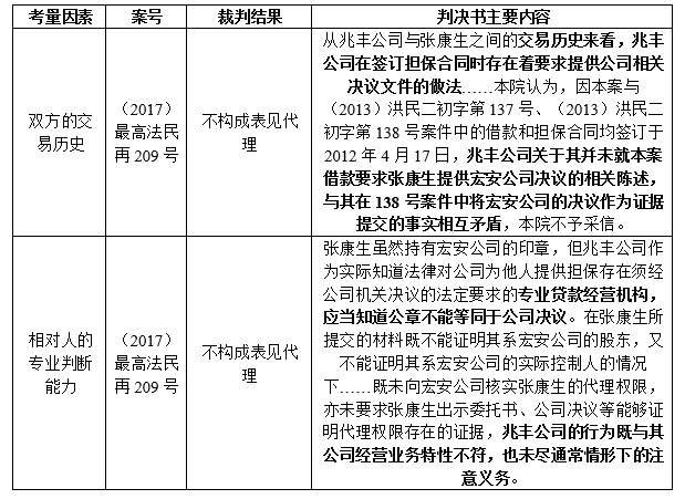 针对上述三个方面,司法判例中具体审查的因素主要包括:1)行为人的职务;2)行为人是否有公司决议或者其他授权文件证明;3)双方的交易历史;4)相对人的专业判断能力;5)被代理人是否明知或应知伪造公章的行为,且是否采取补救措施等。相关司法裁判观点汇总如下:
