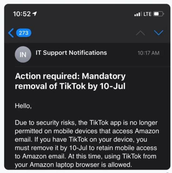 当地时间上周五,美国亚马逊员工收到一封邮件,邮件要求:由于安全隐患,禁止员工在能访问亚马逊电子邮件的移动设备上使用TikTok。