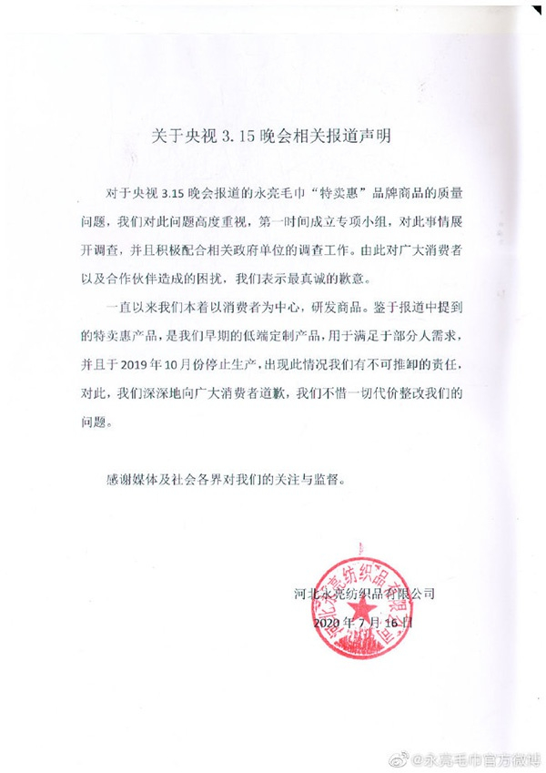 永亮毛巾致歉:315晚会曝光产品去年已停产 将整改 澎湃新闻 澎湃新闻官方账号 2020.07.1712:50 关注 原标题:永亮毛巾致歉:315晚会曝光产品去年已停产,将整改 永亮毛巾对于315晚会的声明