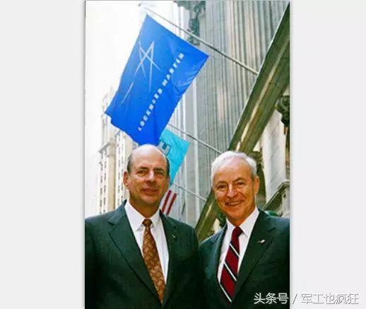 1995年,洛克希德和马丁·玛丽埃塔完成合并。新股发行首日,马丁·玛丽埃塔公司主席诺曼·奥古斯丁(左)与洛克希德公司主席丹尼尔·泰勒普在纽交所外合影。