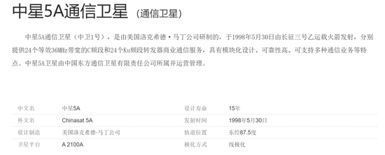 另外,中星5A(中卫1号)通信卫星是中星(Chinasat)系列通信卫星大家庭中的一员,该卫星为洛克希德·马丁公司制造。