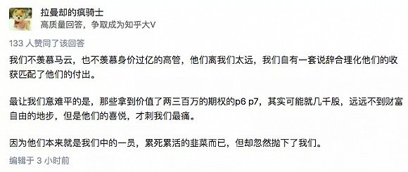 知乎用户@拉曼却的疯骑士 就表示,本来大家都是累死累活韭菜,那些P7以及部分P6,因为拥有小部分期权,就突然变成千万富翁了!手上的泡面突然不香了起来……