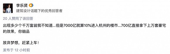 还有网友犀利评论:这与我又有什么关系!于是杭州市民坐不住了,@李乐贤 就指出,700亿进入杭州的楼市,这房价大概率是水涨船高,杭州的普通市民心态很不好。