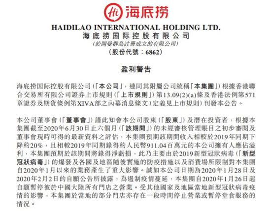 海底捞完成股东配售现有股份、海底捞2020年上半年业绩预告截图来源:海底捞公告