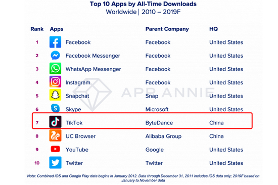 来源App Annie :2010年-2019年,iOS App Store和Google Play商店中下载次数最多的应用
