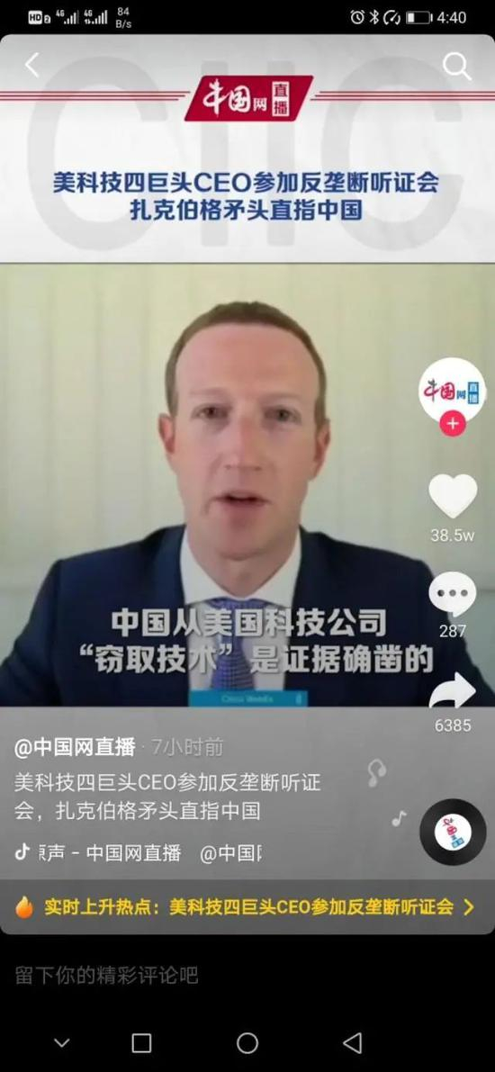 只有扎克伯格声称:中国从美国科技公司窃据技术“是有证据的”。除此之外,扎克伯格就围绕抖音国际版TikTok等议题大做文章,先是污蔑中国科技公司有“危险性”,之后则标榜自家公司“对赢得与中国的网络军备竞赛至关重要”。