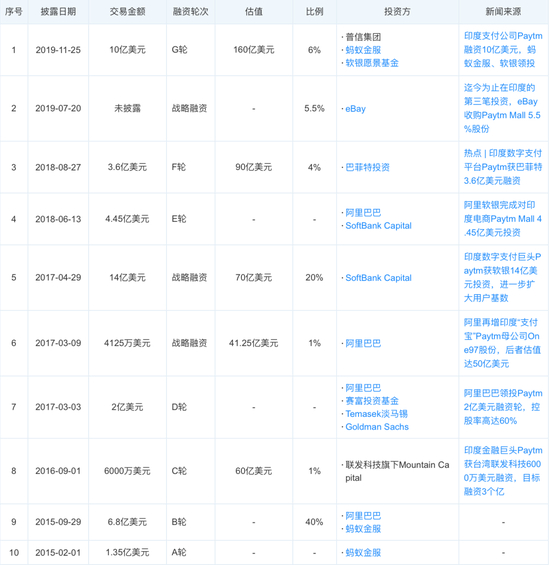 Paytm融资历程 来源 / 天眼查