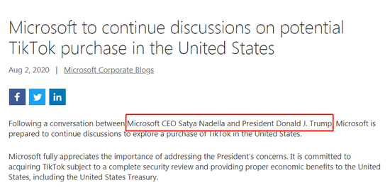 8月3日,特朗普在白宫举行的会议上表示,如果9月15日前无法完成与TikTok相关的收购案,TikTok必须停止在美业务。特朗普还称,TikTok必须由美国企业收购,而且美国财政部也要从中“分一杯羹”。