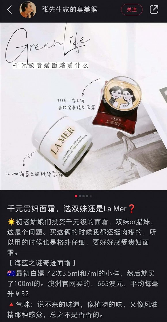 现在双妹的主要销售阵地之一是天猫旗舰店,据店铺信息显示,2013年便已开店,目前有近40万粉丝。界面时尚在商品评论中看到,消费者对产品的评价整体较好。在小红书上,也有一些用户会主动分享双妹的产品,被称作“爆冷门”品牌,甚至还有用户将它和法国奢侈护肤品牌La Mer作比较。