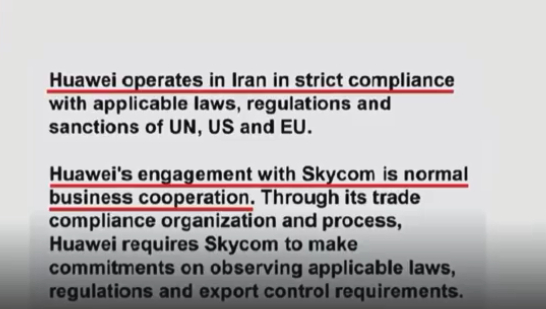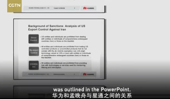 在那次会面中,孟晚舟用PPT介绍了华为通过一家名为星通的公司在伊朗的业务联系,以及华为在遵守美国制裁方面的努力。