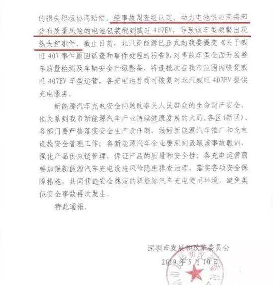 经过2个月调查,深圳市发改委公布事故原因,确定北汽威旺407EV充电自燃是动力电池包有质量风险。