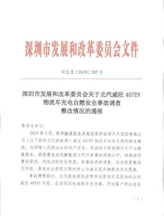 2019年3月,北汽旗下的威旺407EV纯电动货车发生多起充电起火自燃事故。深圳市新能源车辆应用推广中心紧急发文叫停,要求各企业及个人立即停止使用这款车型,各充电运营商不得为该车型提供充电服务。