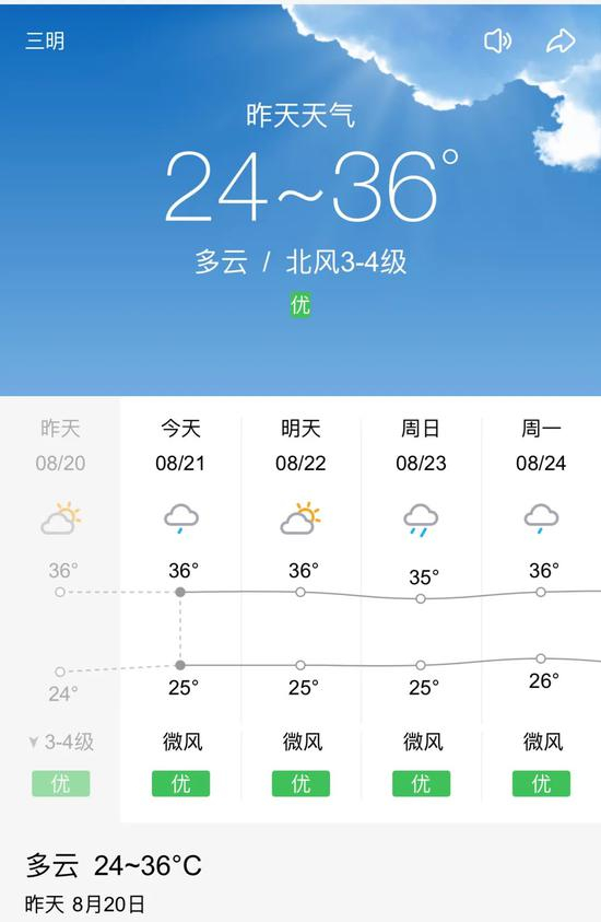 8月20日,福建省三明市天气良好,最高温度36度,最低温度24度,整体环境温度属于正常范围。而在视频中,也未见这款车有遭到机械撞击等外力破坏。