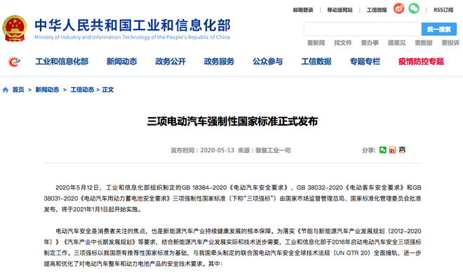 值得一提的是,政府层面对电池安全也是高度专注,就在5月12日,工业和信息化部组织制定的GB 18384-2020《电动汽车安全要求》、GB 38032-2020《电动客车安全要求》和GB 38031-2020《电动汽车用动力蓄电池安全要求》三项强制性国家标准由国家市场监督管理总局、国家标准化管理委员会批准发布,将于2021年1月1日起开始实施。