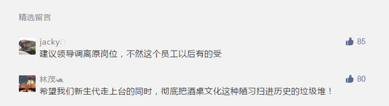 对此,有网友表示,“希望我们新生代走上台的同时,彻底把酒桌文化这种陋习扫进历史的垃圾堆”,获得不少网友点赞。