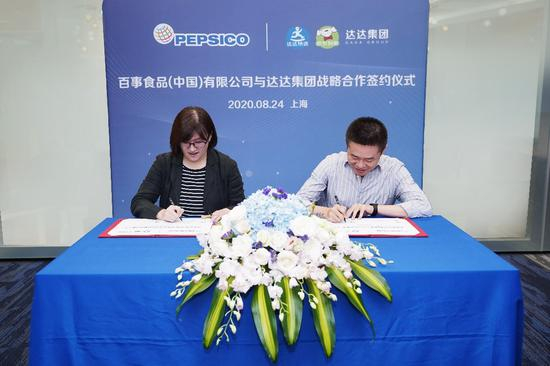 (2020年8月24日,北京)今日,百事食品(中国)有限公司(以下简称百事公司)与国内领先的本地即时零售和配送平台达达集团宣布深化战略合作关系。达达集团创始人、董事会主席兼CEO蒯佳祺与百事公司大中华区食品业务高级副总裁兼总经理谢长安共同签署合作协议。
