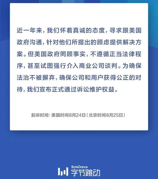 8月23日,字节跳动宣布,将针对特朗普8月6日颁布的第一道行政令——禁止受美国司法管辖的任何企业或个人,与TikTok母公司字节跳动及其子公司进行任何交易——正式起诉美国政府。