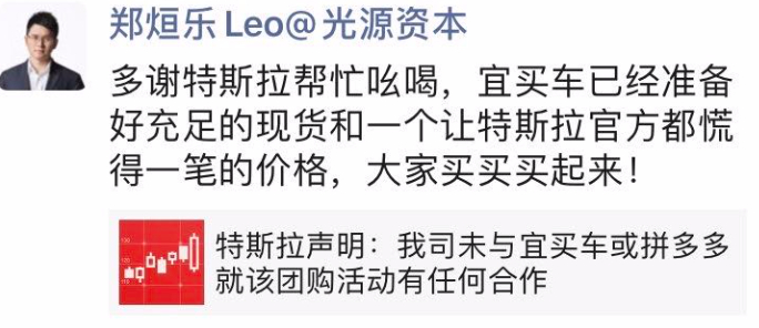 科技自媒体“差评”此前也晒出了另一家投资机构光源资本CEO的朋友圈,显示“宜买车”的野心,绝非一次性卖5辆车赚个吆喝,而是准备长期销售特斯拉。