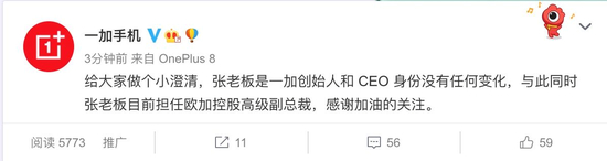 一加手机:刘作虎是一加创始人和CEO身份没有任何变化