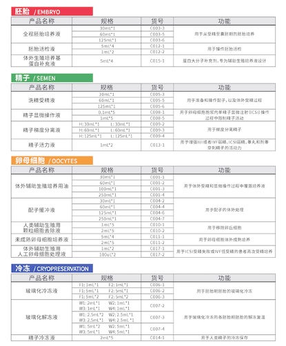 在产品布局上,艾伟孚的策略是全面覆盖国外的培养液品类,在理化、生物安全性和临床效果等指标上不低于进口产品,部分指标如内毒素、囊胚形成率等优于外企。