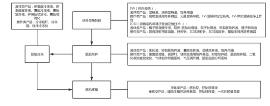 此次艾伟孚首获III类医疗器械注册证的辅助生殖培养用油,属于辅助生殖培养液不可或缺的辅助产品,和胚胎培养液、受精液、配子(精子或卵子)缓冲液等统称为辅助生殖培养用液。辅助生殖试管婴儿技术的流程主要分为配子的获取和处理、体外受精阶段、胚胎培养和胚胎移植,此外中途还可能涉及配子及胚胎的冷冻和复苏。