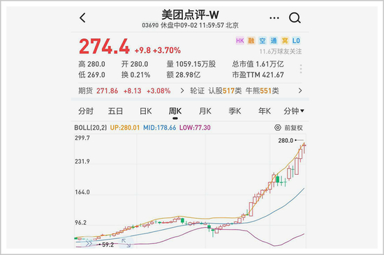 资本市场上,自今年3月中旬股价探底至今,美团股价累计上涨超过200%,连续创出新高,总市值突破1.6万亿,坐稳了中国第三大互联网公司的位置。