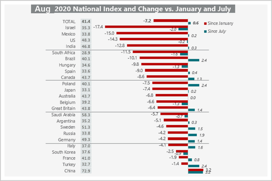 其中,西班牙、俄罗斯等欧洲国家消费者信心指数低于35。
