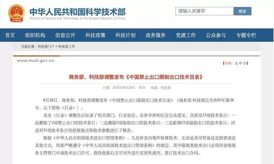 8月28日,商务部、科技部调整发布了《中国禁止出口限制出口技术目录》(以下简称《目录》),其中,在限制出口部分计算机服务业类的信息处理技术项下,新增了第21条“基于数据分析的个性化信息推送服务技术”、第18条“人工智能交互界面技术”。