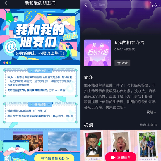 比如,在今年七夕当日,抖音推出“我的相亲介绍”的话题活动,鼓励单身用户将拍好后的个人短视频发布在话题之下,以此来寻找另一半。该话题受到了大量抖音用户的参与,其播放量截止到现在,已达到6900万次之多。