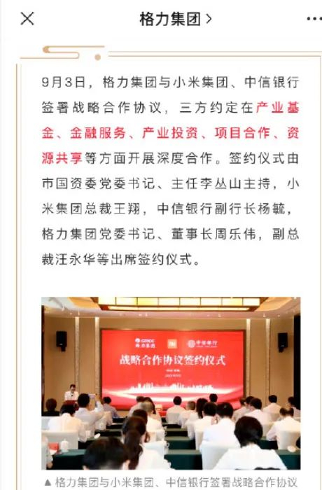 9月4日,来自格力集团官方消息称,3日,格力集团与小米集团、中信银行(00998)签署战略合作协议,三方约定在产业基金、金融服务、产业投资、项目合作、资源共享等方面开展深度合作。