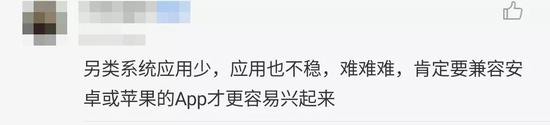 对此,网友表示‘(鸿蒙)另类系统应用少,应用也不稳,难难难,肯定要兼容安卓或苹果的App才更容易兴起来。’