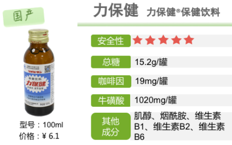 力保健的牛磺酸含量最高为1020mg/100ml(换算成1020mg/罐),其次是红牛牌劲能饮料(奥地利)牛磺酸含量为394mg/100ml(换算成986mg/罐)。