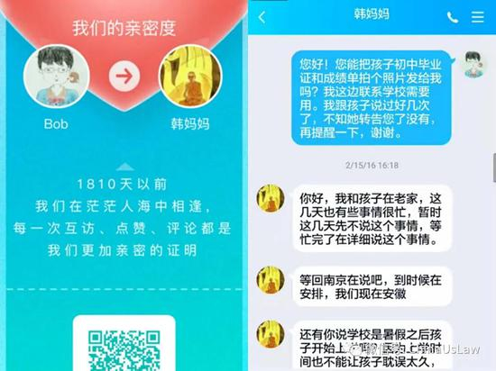 其话题的导语和正文的开头均强调,2015年11月本人带着韩某到北京上学。既然这么重要,那何焰李少威是否询问过韩某是哪家学校并设法核实?显然没有,因为事实是本人2015年根本未带韩某到过北京,而且始终从未带韩某到过任何学校上学(2017年8月联系的学校韩某自己后来拒绝入学)。从下图的聊天记录可见,2016年2月本人还在找韩母女要初中毕业证和成绩单联系学校,而她们始终未给。另外,此聊天记录还顺便戳穿了画皮文所称本人在农历春节没让韩某回老家陪妈妈的谎言。