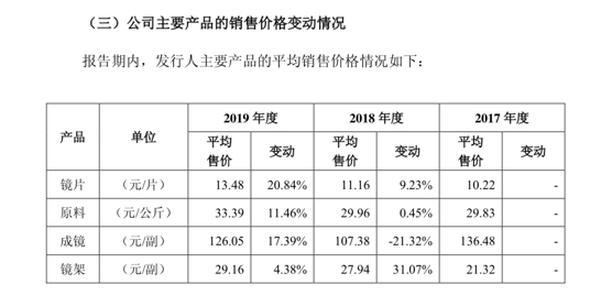 招股书则详细显示了详细价格变动情况。2017年-2019年,明月镜片平均售价为10.22元/片、11.16元/片、13.48元/片。两年间提价幅度为31.11%。其原料(明月镜片也生产一部分镜片原料)、镜架同样连续两年提价,提价幅度接近36%。